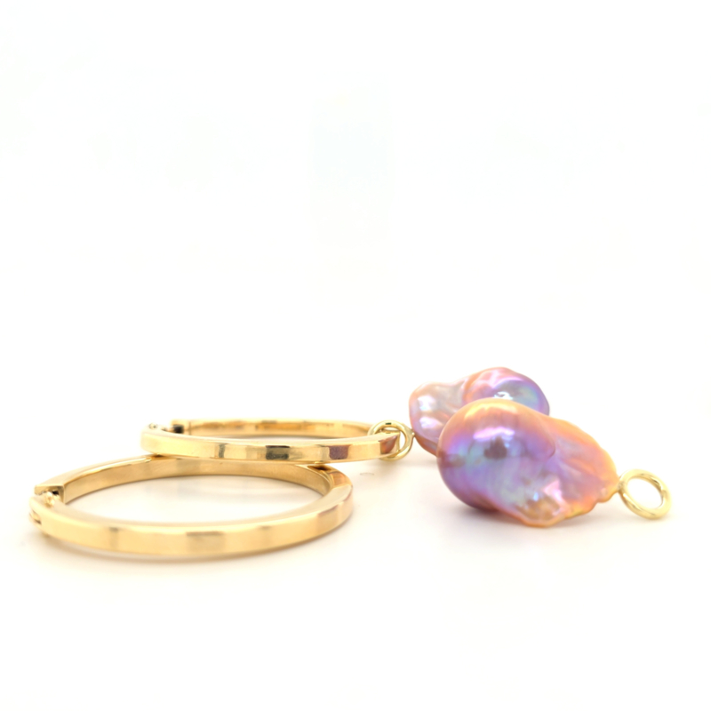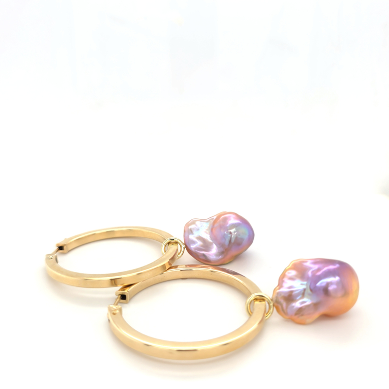 OverzichtDeze 14k geelgouden XL creolen vormen samen met de barokparel hangers een krachtig en elegant geheel. De vierkante creolen geven een moderne, strakke basis, terwijl de organische vormen van de parels zorgen voor een speels en levendig contrast.